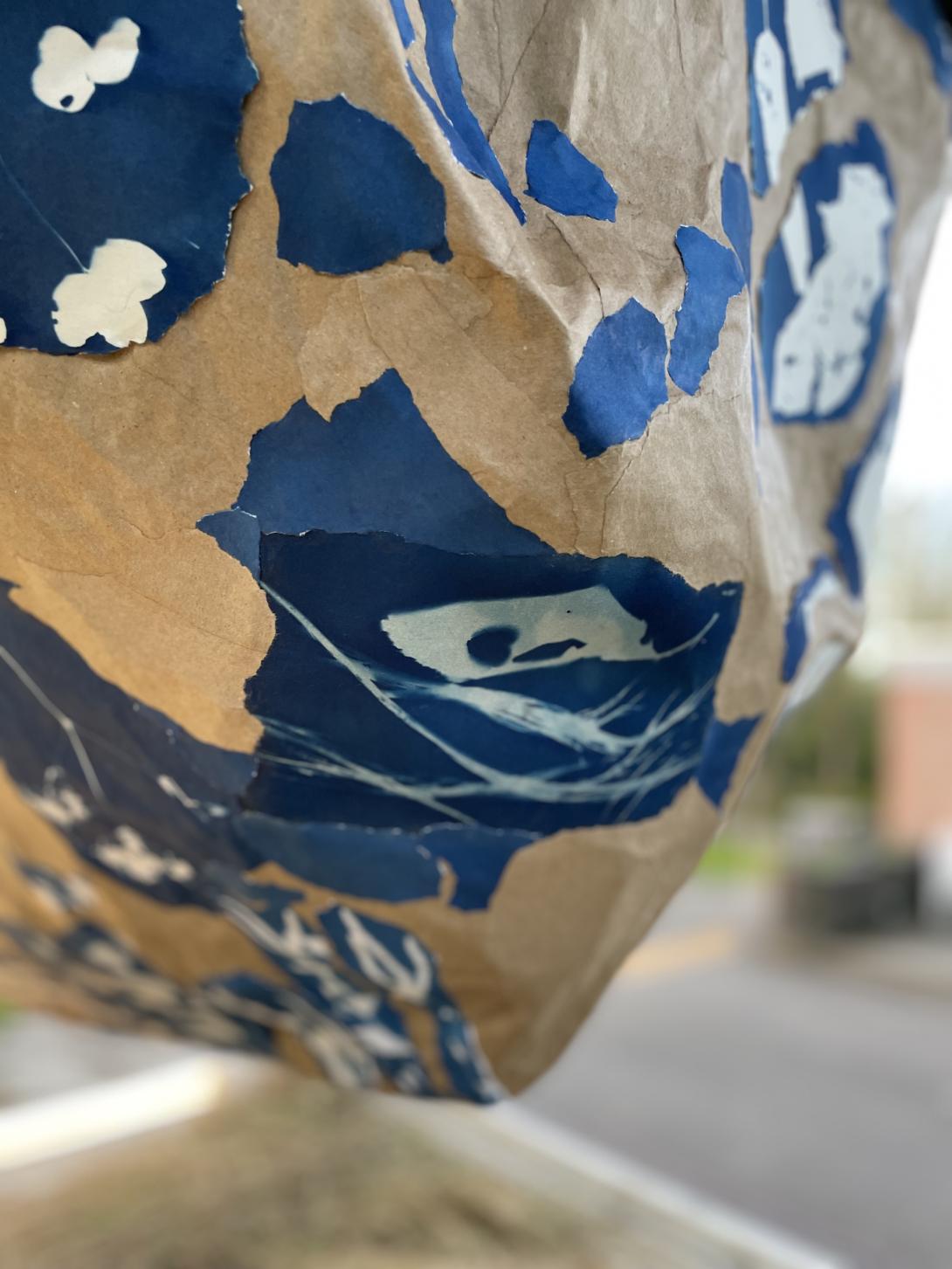 Jeg har været på opdagelse i området omkring værkstedet på Materielgården, hvor natur, kultur og leg mødes i en urban oase mellem industri, ungdomsklub og villakvarter. Gennem det sidste halvandet år har jeg botaniseret, indsamlet, registreret og bearbejdet materialet med fokus på det eksperimenterende. En serie af billedværker, der dokumenterer fragmenter og fund med specifikke øjebliksbilleder i naturen, udforsket i grafisk teknik cyanotypi/blue print som medie, hvor solens lys får motiverne frem med kemi. Her er anvendt udtræk fra brombær og brændenælder fra stedet, for at tilføre naturens egne farver i billederne.